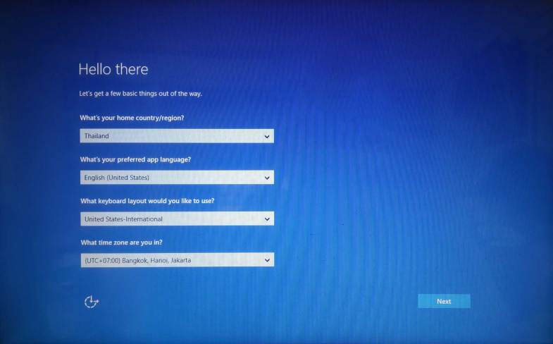 2. เมื่อการก๊อปปี้ไฟล์ต่างๆ เสร็จสมบูรณ์แล้วก็จะเป็นหน้าเลือกประเทศ ภาษา คีย์บอร์ด และเขตเวลา