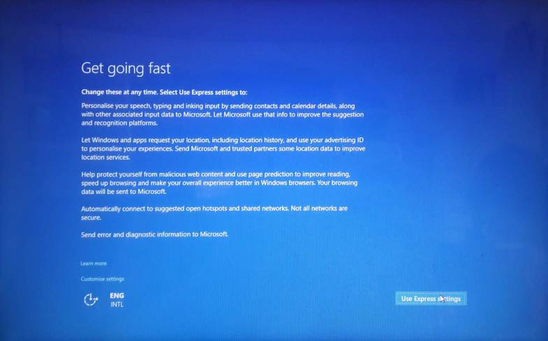 3. ในหน้านี้จะเป็นการตั้งค่าพื้นฐานต่างๆ เช่นการเข้าถึงข้อมูลส่วนตัว สถานที่ การป้องกันภัยคุกคาม หากไม่ต้องการปรับแต่งอะไรสามารถคลิกที่ Use express settings ได้เลย แต่หากต้องการจะเปลี่ยนการตั้งค่าให้คลิกที่ Customise settings