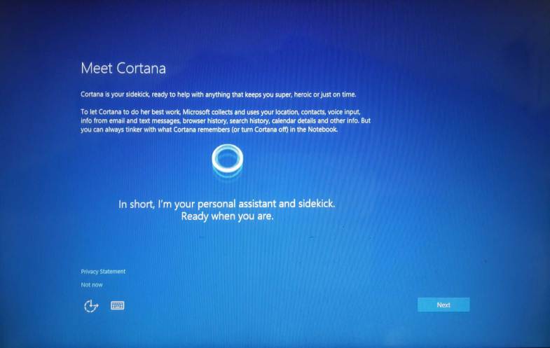 6. คลิก Next เพื่อเปิดผู้ช่วยส่วนตัว Cortana หรือหากไม่ต้องการให้คลิกที่ Not now