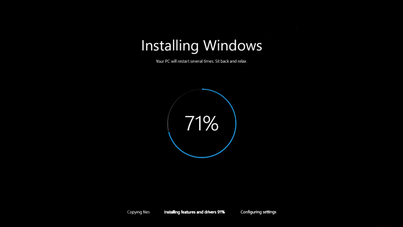 ไม่ว่าจะติดตั้ง Windows 10 ด้วยวิธีใดก็ตาม (อัพเกรด, ติดตั้งจาก ISO, ติดตั้งจากแฟลชไดรฟ์) หน้าจอการติดตั้งก็จะเหมือนกันเมื่อเข้าสู่ขั้นตอนการติดตั้งแล้ว ซึ่งมีดังนี้